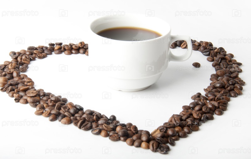 Кружка с кофе и кофейные зерна в виде сердца на белом фоне