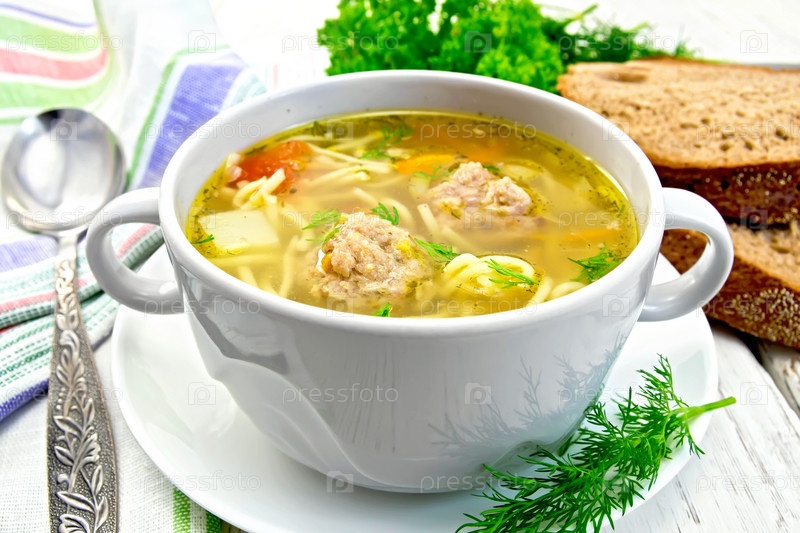 Суп с фрикадельками и лапшой в чаше на блюдце