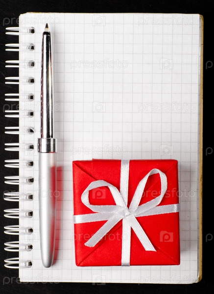 Рождественский подарок и ручка, лежащие на блокноте