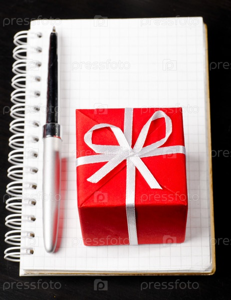 Рождественский подарок и ручка, лежащие на блокноте