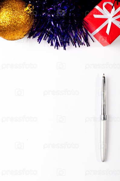 Рождественский подарок, золотистый новогодний шар и мишура с ручкой на белом фоне