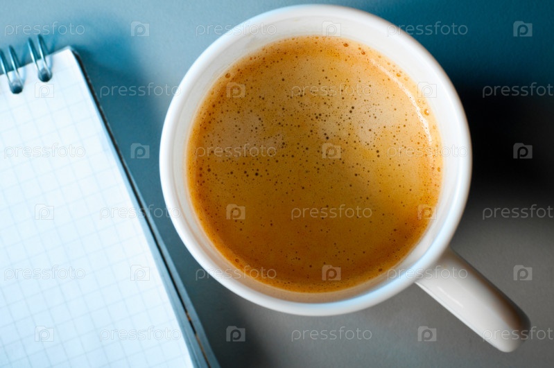 Чашка кофе и блокнот на деревянном офисном столе, вид сверху