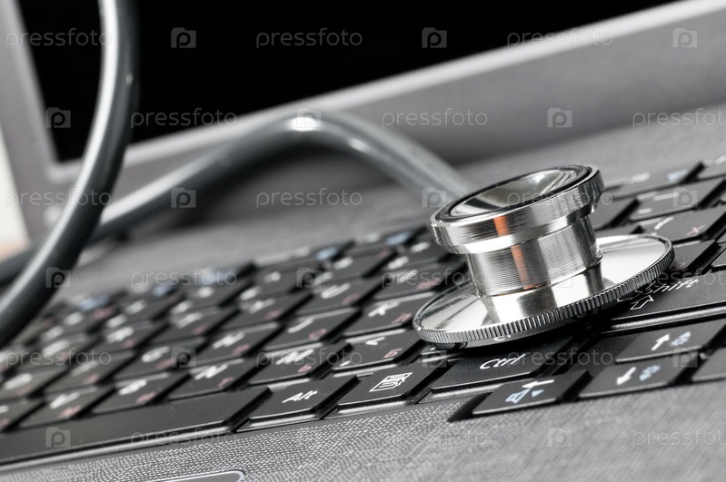 Стетоскоп на клавиатуре ноутбука, крупный план