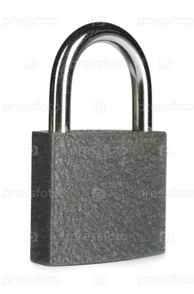 Серый металлический замок на белом фоне