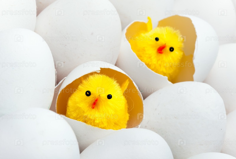 Игрушечные желтые цыплята в яичной скорлупе