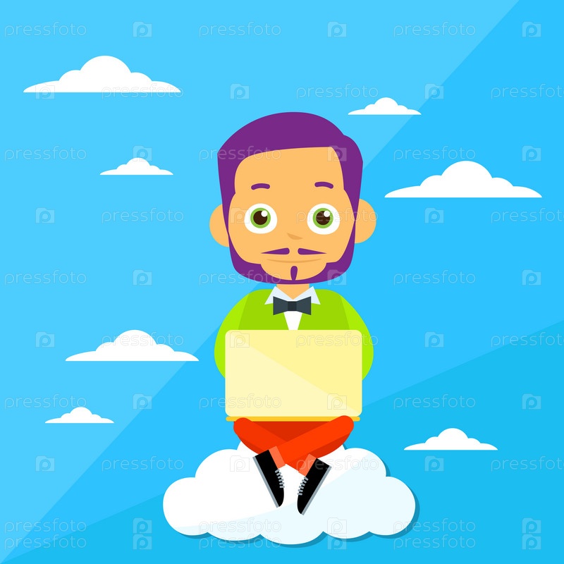 Мультфильм человек, сидящий на облака использовать портативный компьютер, Интернет коммуникации связи концепция