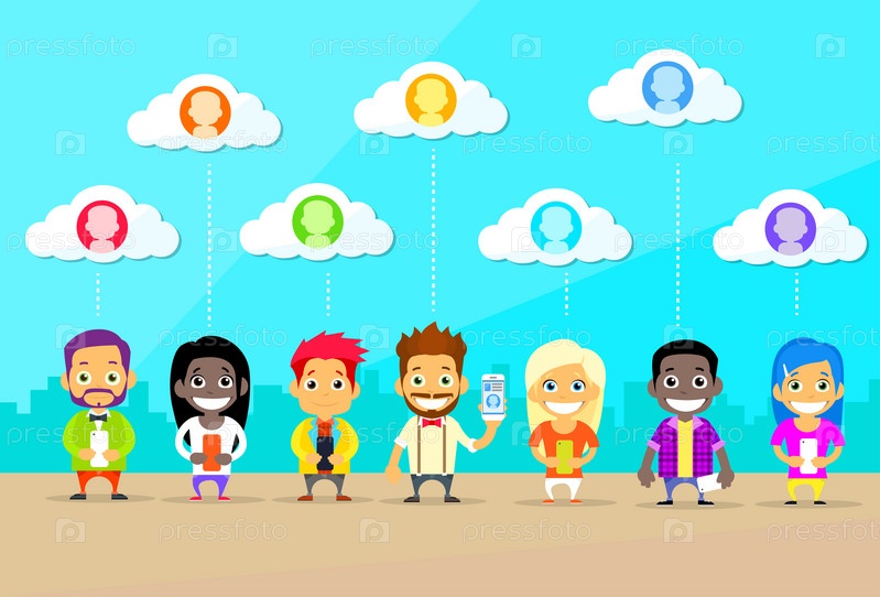 Мультфильм мужчина и женщина люди группы использования смарт-телефонов Интернет связь связи концепция