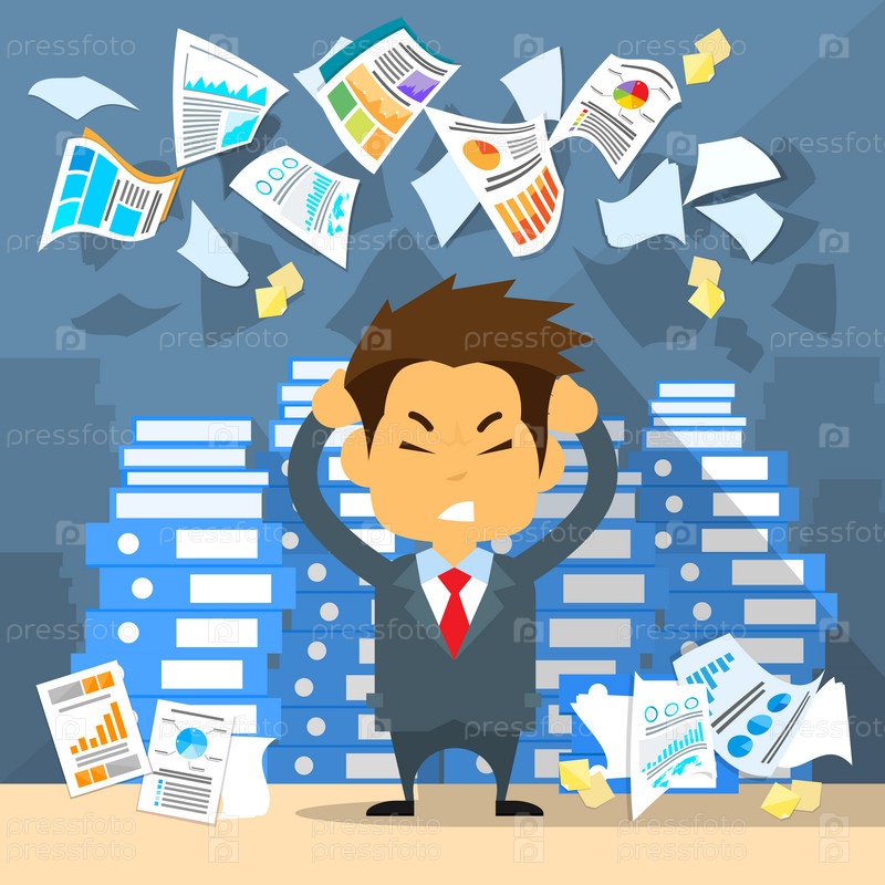 Деловой человек бросить бумаги держать руки на голову храмов, концепция подчеркнул бизнесмен головная боль