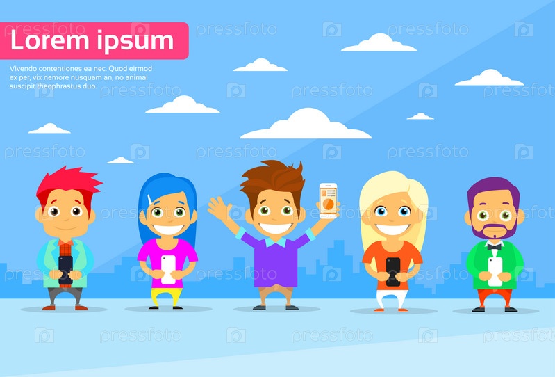 Мультфильм мужчина и женщина люди группы использования смарт-телефонов