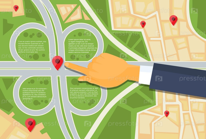 Карта навигации Поиск рука увеличительное стекло улица города с булавки иконы плоский векторные иллюстрации