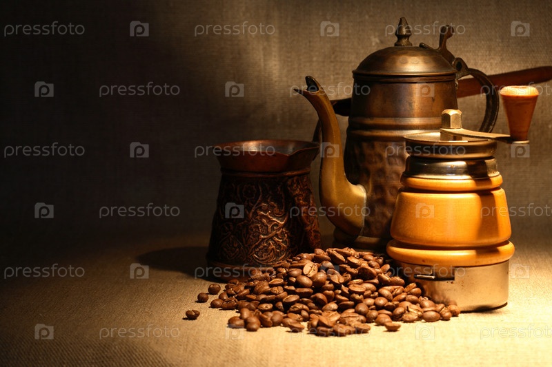 Натюрморт из кофейных зерен и старых медных кофейников на темном фоне