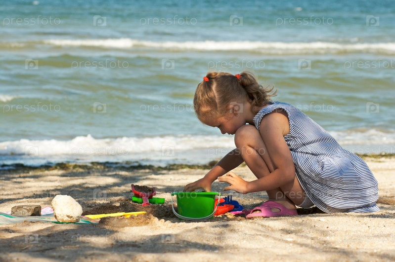 Маленькая девочка играет с песком на берегу моря