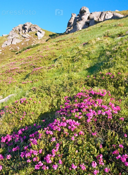 Цветущий розовый рододендрон в горах летом