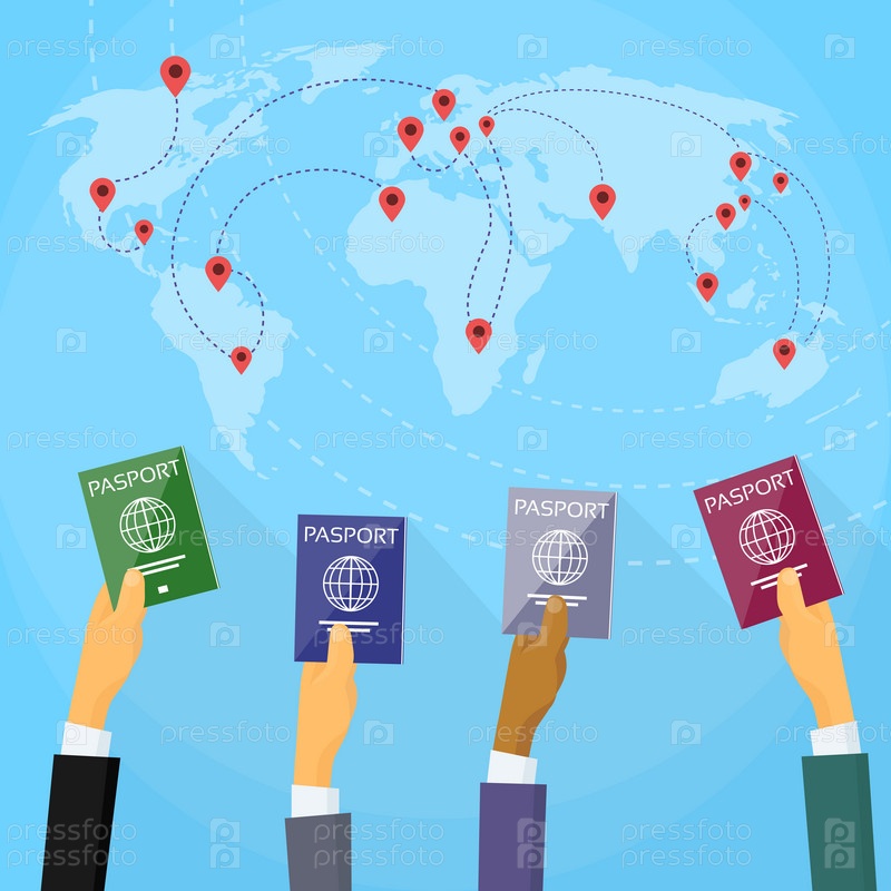 Паспорт руку путешествия документ мира карта плоского вектор