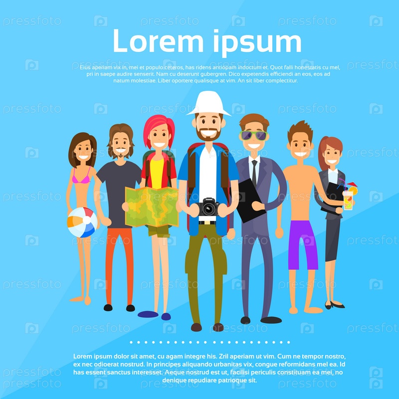 Туристический разнообразная группа людей Мультфильм символов с плоским