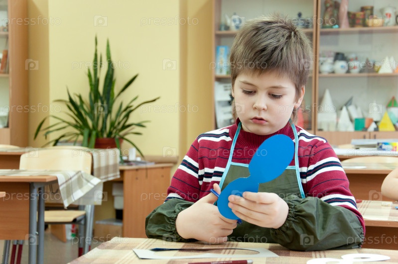 Мальчик делает маскарадную маску в школьном классе