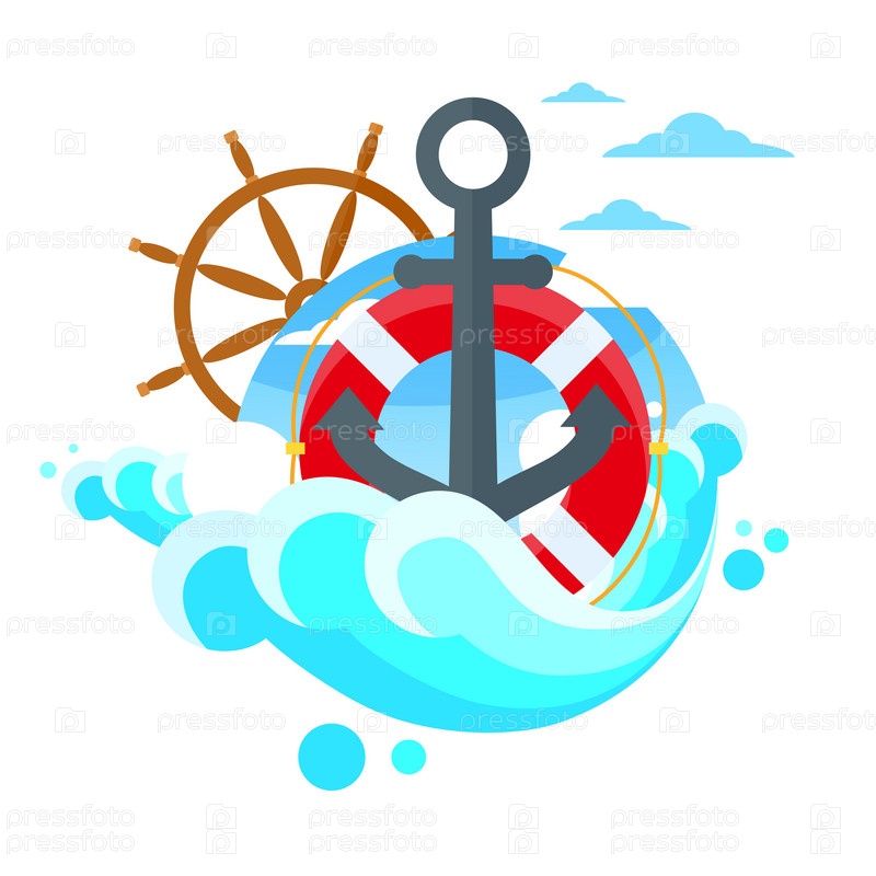 Якорь рулевое колесо морской синий плоский вектор
