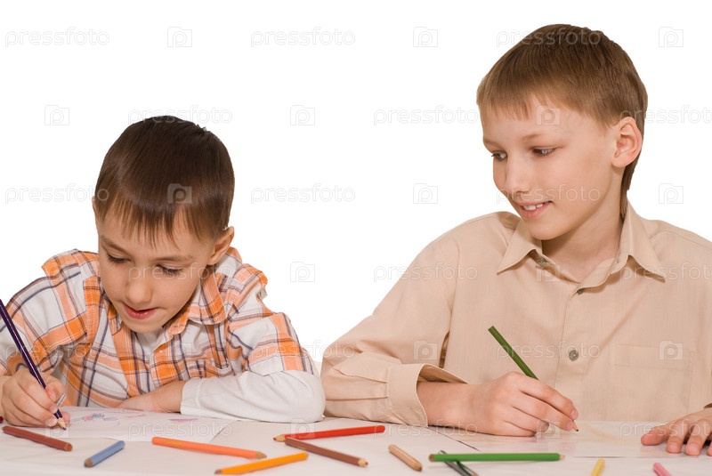 Два брата рисуют сидя за столом на белом фоне