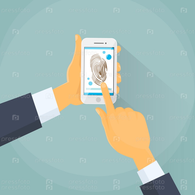 Палец печати смарт-телефона доступа блокировка, деловой человек сенсорный экран отпечатков пальцев