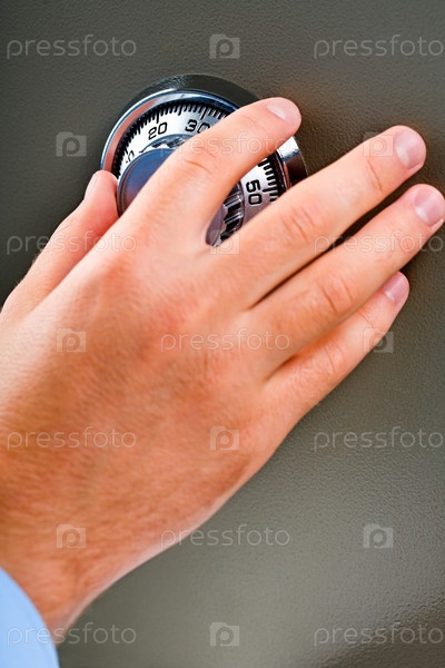 Мужская рука открывает комбинационный замок на сейфе