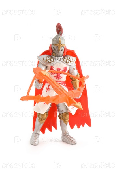 Игрушечный рыцарь в плаще на белом фоне