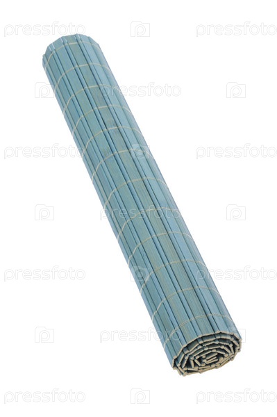 Голубая бамбуковая циновка свернутая в рулон на белом фоне