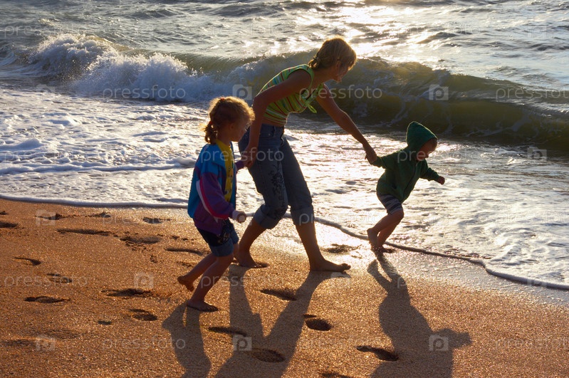 Мать с детьми на пляже