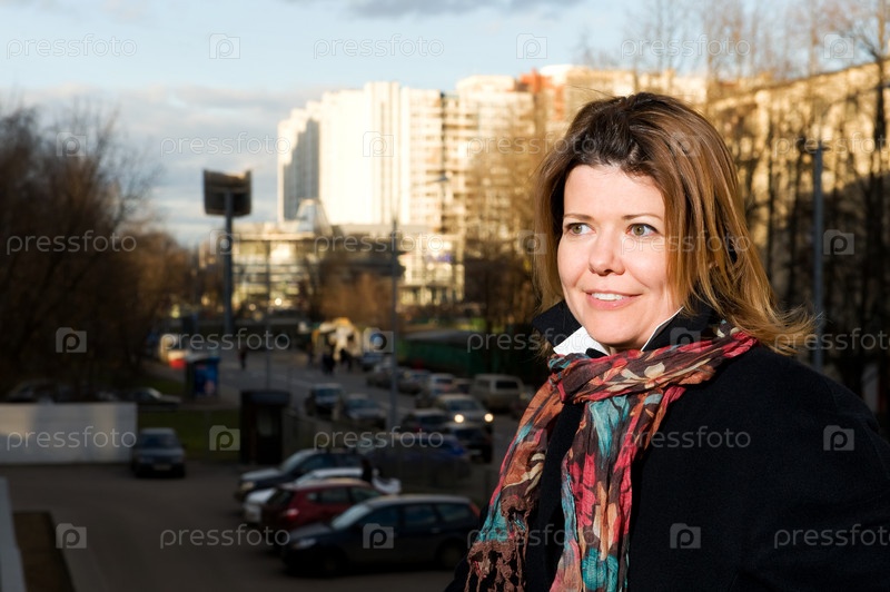 Улыбающаяся женщина на улице в осенней одежде