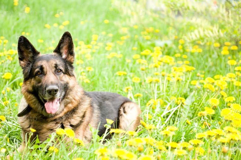 Немецкая овчарка на лугу с Одуванчиками