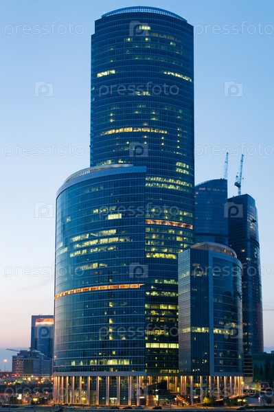 Современные небоскребы вечером в Москве