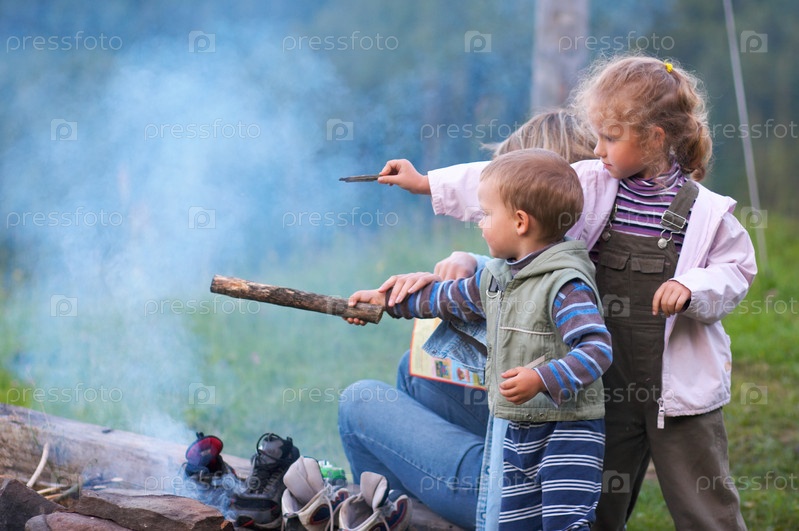 Мать с двумя маленькими детьми возле костра