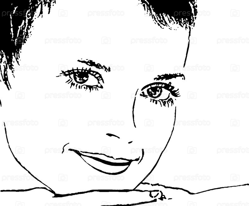 Черно-белая иллюстрация. Портрет улыбающейся девушки. Изолированный на белом фоне
