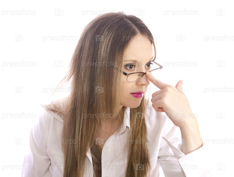 Красивая девушка в белой блузке и очках. Изолированная на белом фоне
