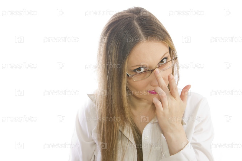 Красивая девушка в белой блузке и очках. Изолированная на белом фоне