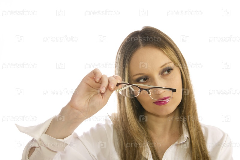 Красивая девушка в белой блузке держит очки. Изолированная на белом фоне