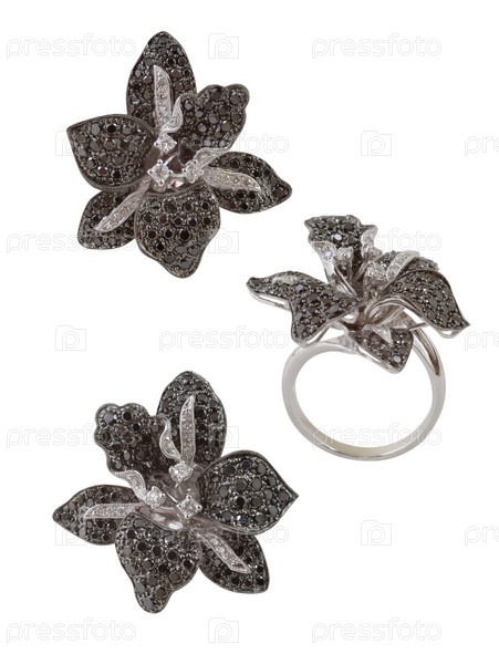 Женские серьги и кольцо на белом фоне