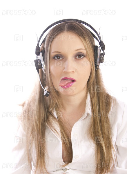 Девушка в наушниках показывает язык. Изолированная на белом фоне