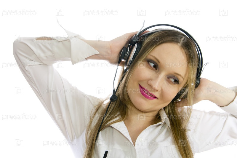 Счастливая девушка в наушниках. Изолированная на белом фоне