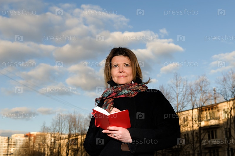 Улыбающаяся женщина на улице в осенней одежде с книгой