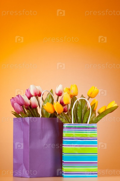 Тюльпаны в пакетах на цветном фоне