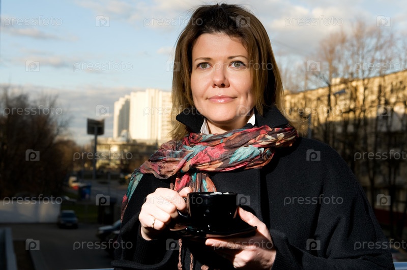 Улыбающаяся женщина на улице в осенней одежде с чашкой кофе