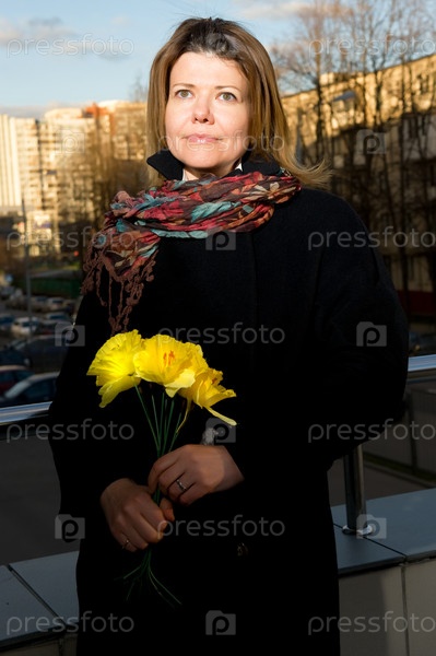 Улыбающаяся женщина на улице в осенней одежде с желтыми цветами