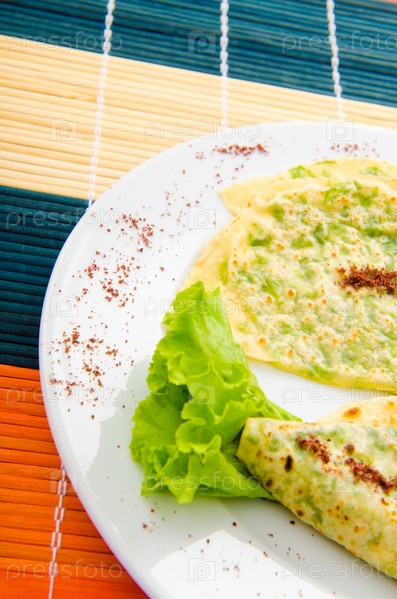 Блины фаршированные зеленью на тарелке