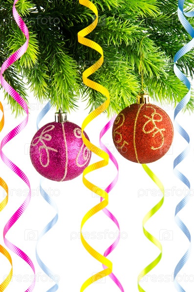 Еловые ветви, украшенные шарами и серпантином