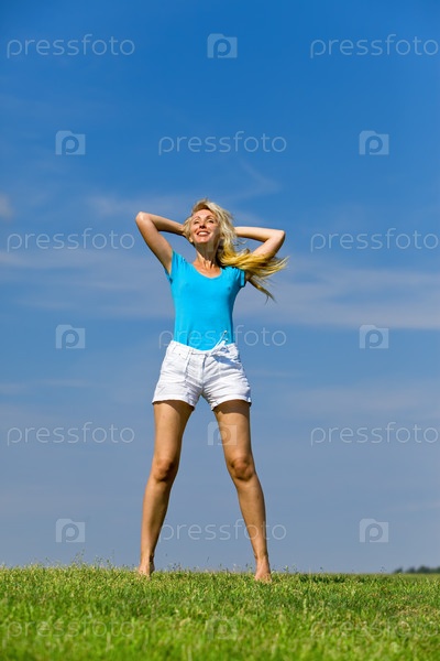 Девушка в поле на фоне синего неба
