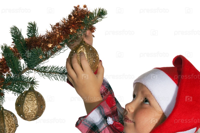 Маленькая девочка наряжает новогоднюю елку на белом фоне