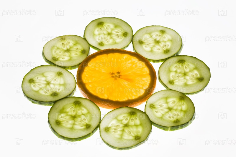 Креативное изображение куска апельсина, окруженного огурцами в форме цветка
