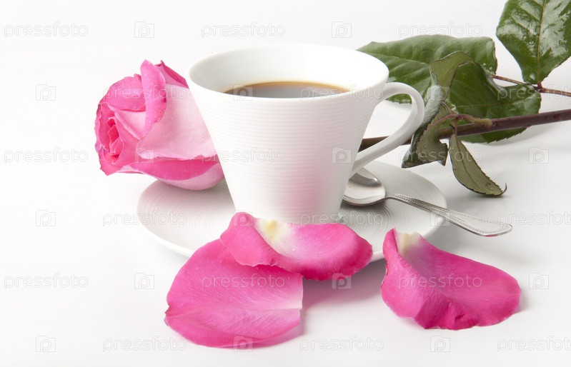 Кружка с кофе и роза на белом фоне