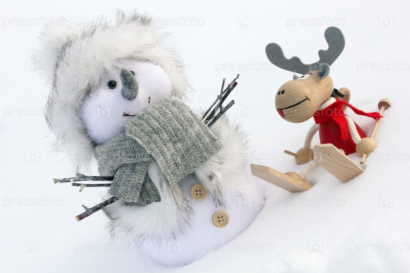 Рождественские символы - олень и снеговик на снегу