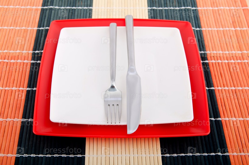 Пустые тарелки, нож и вилка на столе